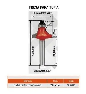 Trata-se de uma fresa quebra canto com rolamento de apoio e dimensões de corte de 1 1/8" de diâmetro e 1/4" de haste, ideal para acabamentos de quebra-canto em madeira maciça ou painéis.