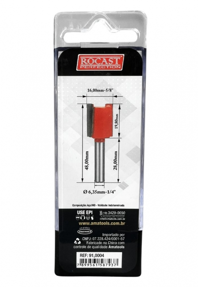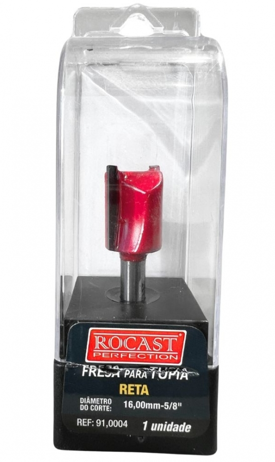 Trata-se de uma fresa reta da marca ROCAST, modelo 91,0004, com medidas de 5/8" de diâmetro por 1/4" de haste - ideal para cortes retos, acabamento e nivelamento em madeira maciça, MDF ou painéis derivados. Fabricada com material de qualidade, oferece durabilidade adequada ao uso em marcenaria e carpintaria. É indicada para usuários que precisam de uma fresa simples, versátil e econômica para tupias