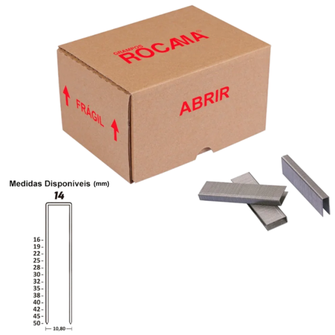Os grampos da linha 14, Indicado para fixações médias, como móveis, estofados (percintas de borrachas elásticas), lastros de camas, urnas funerárias, caixas de frutas e embalagens de madeira.