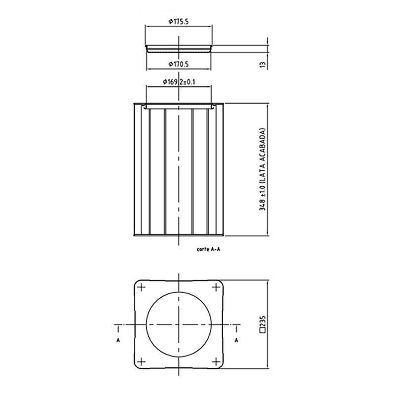 Embalagem metálica de formato quadrangular (base), produzido a partir de aço estanhado ou cromado, composta de 4 peças (anel, tampa, fundo e corpo), destinado ao envase de produtos químicos em geral (tintas, vernizes, tingidores, primers, ALIMENTOS, Etc.).