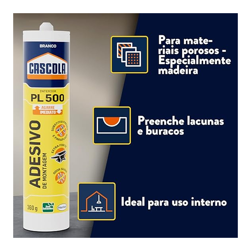 O Cascola Monta & Fixa PL500 Interna é um adesivo de montagem de alta performance, desenvolvido para substituir o uso de pregos e parafusos em aplicações internas. Ideal para fixação de rodapés, guarnições, painéis, molduras, sancas e outros elementos decorativos em ambientes internos. Proporciona aderência imediata, fácil aplicação e acabamento limpo, garantindo praticidade e eficiência.