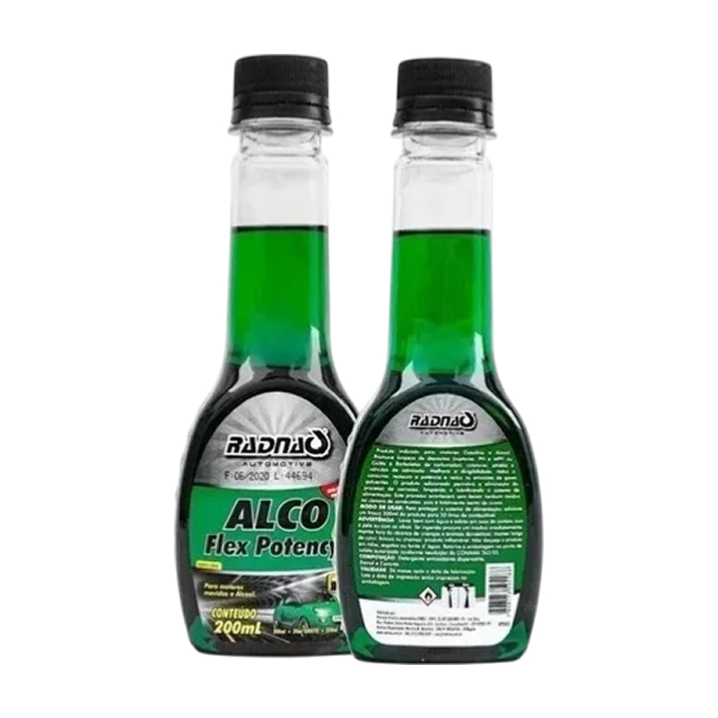 O Alco Flex Potency Radnaq é um aditivo para combustível indicado para motores a Álcool. Promove limpeza de depósitos (Injetores, PFI e MPFI ou Giclês e Borboletas de Carburador), coletores, janelas e válvulas de admissão. Melhora a dirigibilidade, reduz o consumo, restaura a potência e reduz as emissões de gases poluentes. O produto adicionado permitirá a eliminação do processo de corrosão, limpando e lubrificando o sistema de alimentação. Este processo acontecerá sem deixar nenhum resíduo na câmara de combustão, pois é totalmente isento de cinzas.