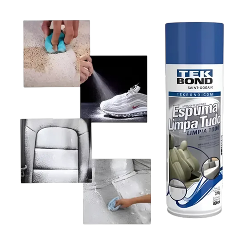 O Limpa Tudo Espuma Spray Tekbond 400ml/370g é um limpador multiuso em aerossol desenvolvido para facilitar a higienização de diversas superfícies. Sua fórmula em espuma atua profundamente, removendo sujeiras, manchas, gorduras e odores indesejados sem agredir o material. Prático e eficiente, pode ser aplicado em estofados, carpetes, tecidos, painéis automotivos, eletrodomésticos, superfícies laváveis e muito mais.