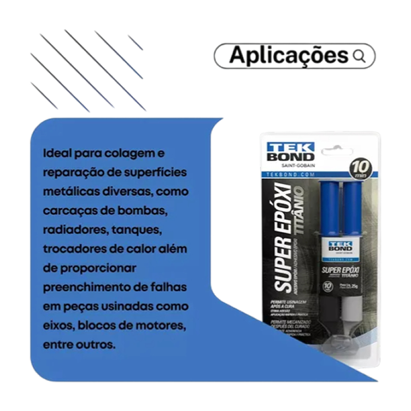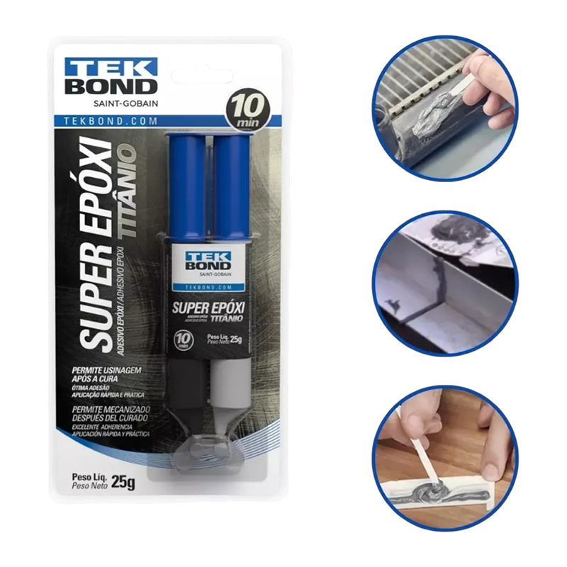O Super Epóxi Titânio TekBond é um adesivo epóxi bicomponente de alta performance, ideal para colar, reconstruir e reparar metais, madeira, cerâmica, pedra e alguns plásticos rígidos. Sua fórmula reforçada com titânio oferece máxima resistência mecânica e durabilidade, permitindo usinagem, lixamento e pintura após a cura. Perfeito para reparos em motores, carcaças, radiadores, tanques, blocos e eixos metálicos.
