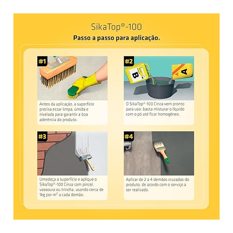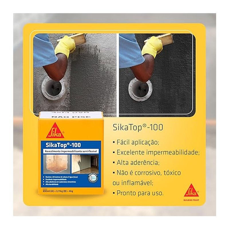 O SikaTop® 100 é um revestimento impermeabilizante bicomponente, semi-flexível, à base de cimento, areias selecionadas e resina acrílica. Projetado para uso em concreto, argamassa ou alvenaria, oferece excelente aderência e impermeabilidade. Fácil de aplicar, basta misturar os componentes A (líquido) e B (pó). Ideal para ambientes internos e externos, como caixas d´água, piscinas, poços de elevadores, tanques, cisternas, áreas frias (banheiros, lavanderias, cozinhas) e áreas sujeitas à umidade.