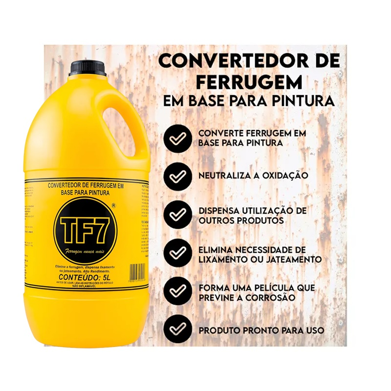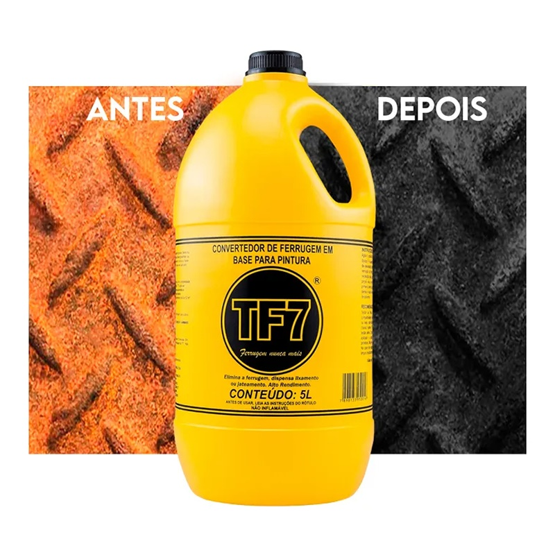 O Convertedor de Ferrugem TF7 5L é um produto pronto para uso, desenvolvido para tratar e proteger superfícies metálicas oxidadas. Sua fórmula à base de água converte a ferrugem em uma camada protetora e atua como fundo (primer) para pintura, garantindo excelente aderência e durabilidade do acabamento.
