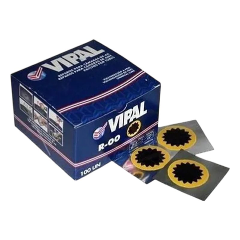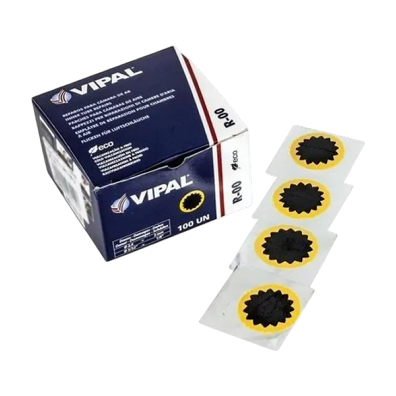 O remendo redondo Vipal R-00 1300 é um remendo a frio projetado para reparar câmaras de ar, especialmente para furos redondos como os causados por pregos e objetos pontiagudos. Possui uma camada autovulcanizante preta que garante boa adesão sem necessidade de calor, proporcionando vedação eficiente. O acabamento preto torna o reparo mais discreto. Utiliza-se cimento vulcanizante ( "cimento a frio" ) apropriado para fixá-lo. É apropriado para uso profissional (oficinas, borracharias), bem como uso doméstico ou para bicicletas, motos, etc.
